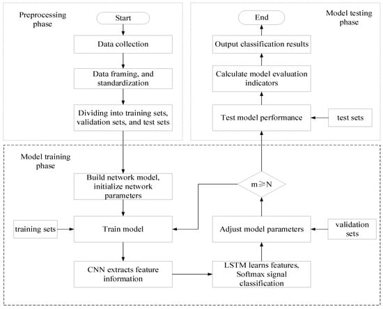 Given the limitations of traditional feature extraction methods, deep learning approaches offer an alternative by performing end-to-end signal classification without the need for manual feature extraction []. These methods generally demonstrate better performance in multi-classification problems with large sample sizes []. Neural networks update model parameters and extract features through learning and error backpropagation using large batches of training samples, thereby completing model training effectively.