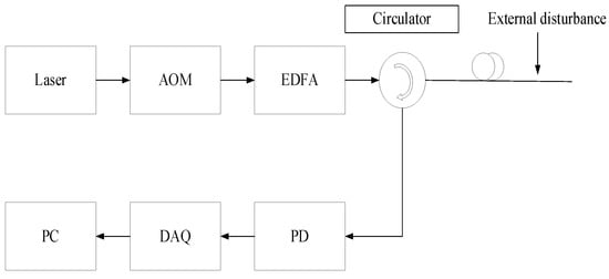 Under ideal conditions, the intensity of the backward Rayleigh scattered signal is only linearly related to the pulse width. When the light source is stable and no disturbance occurs, the intensity of the signal returned at each position of the optical fiber remains stable; conversely, when the optical fiber is disturbed by an external event, the phase of the backward Rayleigh scattered light at that position changes due to the elastic–optic effect (the manufacturing process of the optical fiber and the change in the refractive index caused by bending). The effect signal of the external disturbance on the optical fiber is obtained by phase demodulation. The demodulated optical signal is converted into an electrical signal by a photodetector (PD), which is then collected by a data acquisition card (DAQ). After preprocessing on the PC side, different types of vibration signals are detected and identified [].