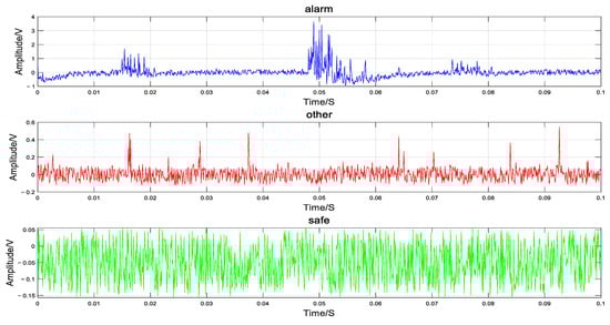 By analyzing the time-domain waveform characteristics of the three signals, it can be seen that the Alarm signal has obvious amplitude changes, and the maximum amplitude is much higher than the other two types of signals. Since the Other signal comes from the sound of wind in nature, there are some small floating and irregular amplitude changes in its time-domain waveform, and the amplitude is smaller than that of the Alarm signal. For the Safe signal, its amplitude is small, relatively stable, and presents a standard sawtooth waveform, which is significantly different from the Alarm signal waveform, mostly from the background noise in the environment and the internal noise of the components.