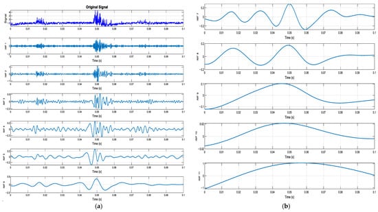 Decomposed IMF component time-domain plot. (a) IMF1-IMF6; (b) IMF7-IMF12.