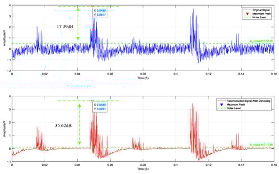 In Figure 5, the SNR of the original Alarm signal collected is 17.39 dB. After using the above denoising algorithm, the SNR of the original signal is increased to 35.62 dB. It can be seen from Figure 5 that the algorithm retains the overall contours of the signal’s time-domain waveform, such as the peaks and troughs, and the high-frequency information at the disturbance position is also maintained. At the same time, the noise at other positions is suppressed, and the signal’s SNR is improved [].