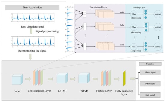 The network structure of the optical fiber vibration signal classification model used in this experiment is shown in Figure 6. The model mainly consists of a signal input layer, CNN convolution layer, pooling layer, LSTM layer, and classification output layer. The one-dimensional optical fiber vibration signal was standardized, the EMD algorithm was used to remove the noise in the high-frequency component, and it was divided into signal segments of fixed lengths (the signal in this experiment intercepts 1024 signal points). The data sample was constructed, with 70% divided into a training set, 10% as a validation set, and 20% as a test set. The input signal was input into the CNN convolution layer to extract the features of the three different signals adaptively. The extracted features were then reduced in dimension through the maximum pooling operation, effectively reducing data redundancy and retaining key feature information. After dimensionality reduction, the feature data were then input into the LSTM layer, and its ability to model time-series dependencies was used to train the neural network.