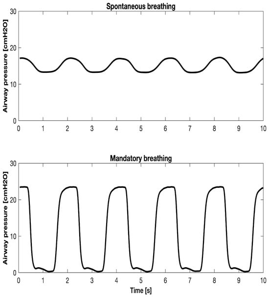 A typical airway pressure waveform over time during NPV. In the upper panel, the airway pressure waveform of spontaneous ventilation under CPAP is shown, whereas the lower panel shows mandatory ventilation.