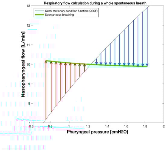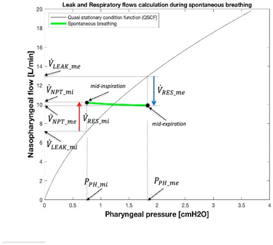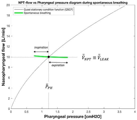 vs. PPH diagram during spontaneous breathing. The continuous line curve in this figure represents Equation (10) (Figure 5b, QSCF). The green segment is formed by the couple of pharyngeal pressure (PPH) and nasopharyngeal flow () values measured during spontaneous breathing.