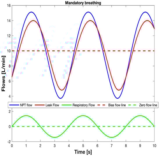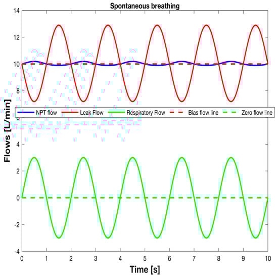 Unlike mechanical ventilation, where the leak flow at the interface occurs only when the cuff at the distal end of the endotracheal tube is not properly sealed to the inner wall of the trachea or is intentionally left deflated [,], during NIV, leak flow occurs systematically at all types of interfaces and cannot be avoided [,,]. In addition, the magnitude of this leak flow cannot be predicted or estimated during treatment, so the output signal from the monitoring system’s sensors is not useful for accurate measurements of the respiratory flow waveform over time [,,]. Specifically, because the flow sensor is placed upstream of the leak that occurs at the interface, its reading output overestimates or underestimates the instantaneous value of the true respiratory flow during inspiration and expiration, respectively. As a result, erroneous readings, if not corrected or compensated for, lead to unacceptable errors in the respiratory flow waveform over time and, consequently, in both the inspiratory and expiratory tidal volumes.