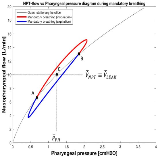 vs. PPH diagram during mandatory breathing. The continuous line curve in this figure represents Equation (10) (Figure 5b, quasi stationary function). Note that during mandatory breathing, the green segment in Figure 6 is now an ellipsoid. The three solid black dots A, B, and C mark the beginning of inspiration, beginning of expiration, and the equilibrium point set by bias flow (, ), respectively. At both points A and B, is zero.
