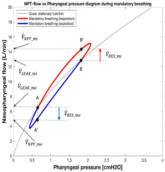 Graphical method to calculate and at mid-inspiration and mid-expiration times during mandatory breathing. Starting from point B’, associated with mid-inspiration on the red loop, a vertical line is drawn to the x-axis until it intersects the quasi stationary function (Equation (10), Figure 5b) at point B. From point B, a horizontal line is projected on the y-axis. The point of intersection represents at mid-inspiration. is calculated from Equation (1) as the difference between and (red arrow). The blue arrow represents at mid-expiration (point A’ and its projection on the loop, point A).