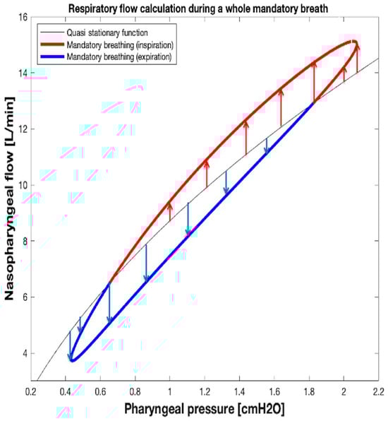 When a patient remains apneic, manual mandatory breaths are supplied by the FFODD. In this case, a closed curve with ellipse-shaped (hysteresis loop) travelling clockwise appears in the vs. PPH diagram. The geometrical center of the loop is the equilibrium point set by bias flow () and corresponding to PPH value () belonging to the − PPH relationship at apnea (Figure 5b and Figure 10, quasi stationary function). An example of the loop related to a whole breath is shown in Figure 10 with two colors: red and blue.