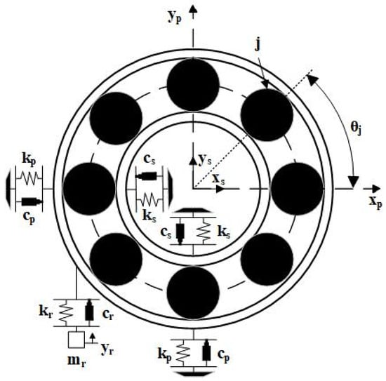 The five-degree-of-freedom (5-DoF) bearing dynamics model describes the nonlinear dynamic behavior of the bearing, as shown in Figure 3.