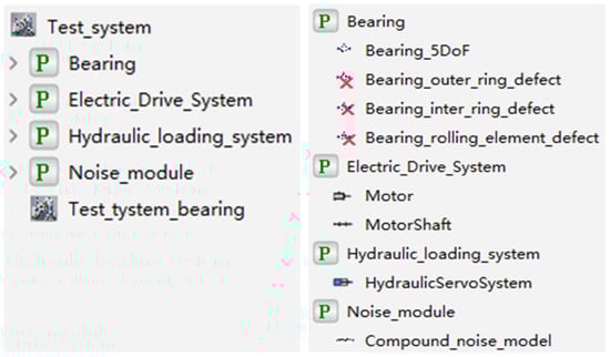 A comprehensive digital twin integrated model for rolling bearings is constructed based on digital twin technology, using deep groove ball bearings as an example. A digital twin model for deep groove ball bearings under different health states is established using the Modelica modeling approach. Additionally, a digital twin model for the motor–shaft system, hydraulic system, and random noise is developed. Interfaces for the inputs and outputs of each component are created, connecting them into a complete digital twin model system. By running the twin model with given parameters and updating defect parameters using fitted degradation curves, fault data and full-life degradation data are generated. A hybrid modeling approach combining block diagram modeling and acausal modeling is employed to build a digital twin integrated model library for the full lifecycle of rolling bearings, as illustrated in Figure 5.
