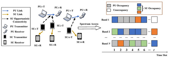 We consider a cognitive radio network dynamic spectrum access scenario consisting of N primary users and M secondary users, with PUs and SUs denoted by and , respectively. In Figure 1, each user consists of a transmitter and a receiver. The PUs and SUs operate in a clock-synchronized manner, the channel state of the PUs and the channel access of the SUs are updated once for each time slot, and no cooperative communication takes place between the PUs and SUs. Each PU is assigned a licensed channel, and all channels are mutually orthogonal, meaning that each PU transmits on its channel without interference between channels. In addition, the busy and idle periods of each channel are respectively given by the independent random processes, and the arrival rate of the on channel n is a Poisson process [9]. The SUs share the channels of the PUs in opportunistic spectrum access mode. In this mode, the PUs have priority use of the channels, and the SUs can access them for data transmission only when the channels of the PUs are idle. The SU senses the spectrum state of the PU to select the idle channel to access. Let the spectrum state sensed by the at time slot t be represented as , where , and indicates that channel n is occupied by the , while indicates that it is unoccupied.