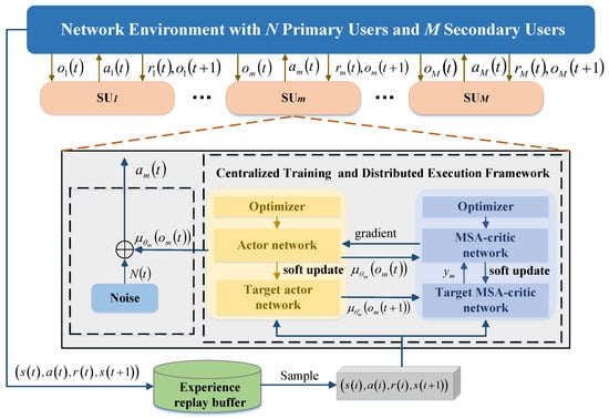 Subsequently, the experience entries of all SUs are merged into a multidimensional vector and stored in the experience replay buffer to update network parameters. To enhance the stability of training and reduce the overestimation of action values by the critic network, the target network is introduced, including the target actor network and target critic network. The structure of the target network is the same as that of the corresponding actor network and the critic network.