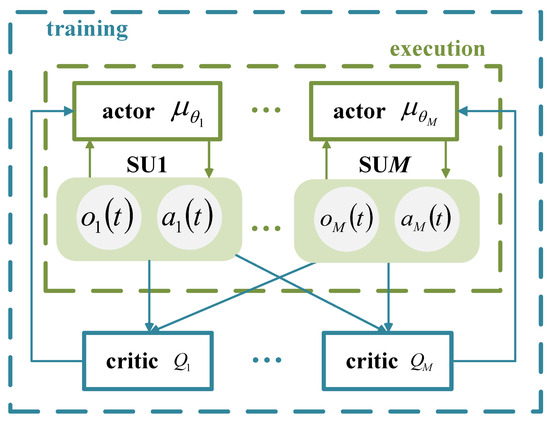 Each SU operates within a network based on the Actor–Critic (AC) framework, where the actor network generates actions based on the observations of the SU. The critic network provides feedback by evaluating the value of the actions, assisting the actor network in optimizing its policy. The centralized training with decentralized execution framework for multiple SUs is shown in Figure 3. During training, the input to the actor network is the observation of each SU, denoted as , and the output is represented as . To improve the exploration capabilities of the agent, noise is added to the output of the actor network, and the action of is represented as , where decays with an increase in the training episodes. The input to the critic network consists of the observations and actions of all SUs, represented as , and the output is the action-value function . During execution, the input to the actor network is the observation of each SU, and the output is the action of the SU, with no exploration noise applied at this phase.