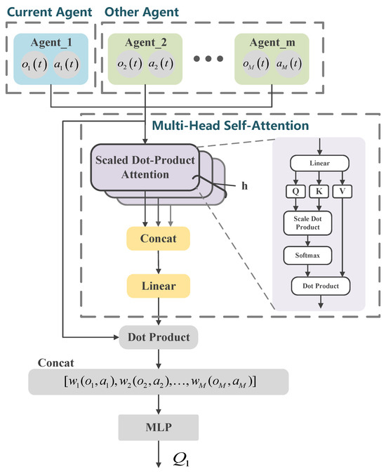 In the MADRL-OSA network described in Section 4, each agent has an independent critic network. The critic network evaluates the action value of the actions of the current agent in a given state, providing gradient information to optimize the policy of the actor network. To more accurately model the complex interactions among multiple agents, the critic network introduces an MSA mechanism to explicitly capture these interactions, enabling a more precise understanding of how other agents influence the decision-making of the current agent. As shown in Figure 4, the MSA–critic network takes the observations and actions of all agents as input and passes them through the MSA layer. The self-attention mechanism computes attention weights between the current agent and other agents, quantifying the degree of importance of each other agent on the current agent. These weights are then used to perform a weighted aggregation of the observations and actions of other agents, which are concatenated to form the context information for the current agent.