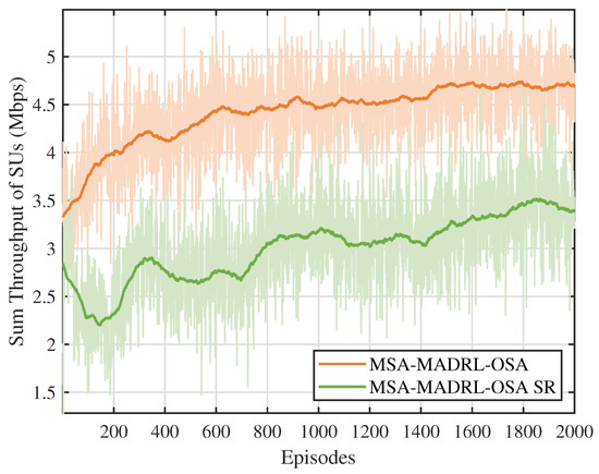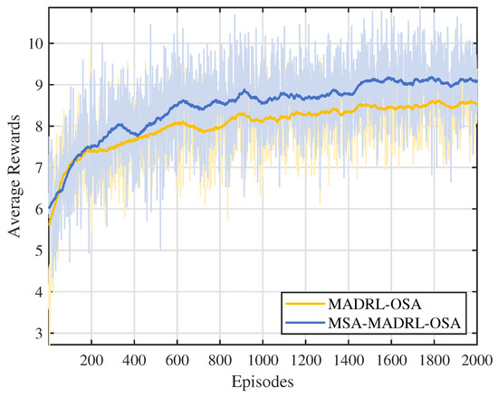 - MSA-MADRL-OSA SR: This method employs the sparse reward (SR) function described in Section 4.2, with all other network architectures and simulation settings the same as those of MSA-MADRL-OSA.