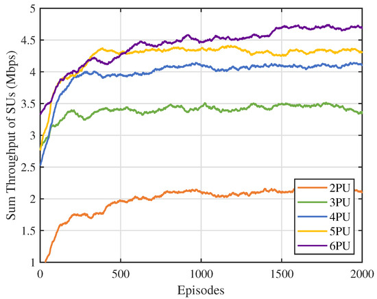First, we analyzed the impact of the number of channels N on the performance of the MSA-MADRL-OSA method. Figure 7 illustrates the variation in the sum throughput of SUs under different values of N. The experimental results show that the method converges stably within 2000 episodes for any value of N, indicating that its convergence ability is not affected by the increase in the number of channels, thus highlighting its excellent scalability. Figure 8 compares the sum throughput of SUs with the number of PUs under different methods. As the number of channels increases, the sum throughput of SUs improves for all methods. However, when N becomes large, the rate of throughput increase gradually slows down. This occurs because, as channel resources increase, SUs can distribute more evenly across different channels, causing more SUs to approach their SNR limits, which constrains throughput growth. Nevertheless, the experimental results demonstrate that the MSA-MADRL-OSA method significantly outperforms other comparison methods across all channel configurations. Compared to the second-best-performing method, MSA-MADRL-OSA achieves an average improvement of 8.29% in sum throughput for SUs. The MSA-MADRL-OSA method dynamically adapts to changes in the number of channels and by optimizing channel selection and power control policies, it maintains high throughput performance in complex environments, demonstrating exceptional scalability and adaptability.