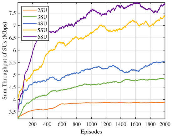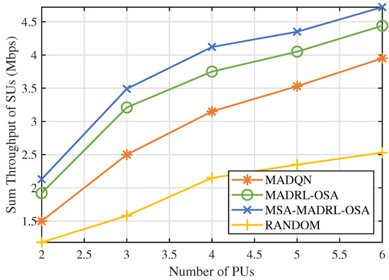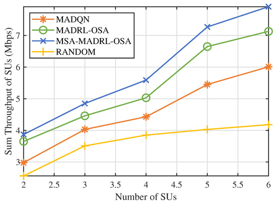 Next, we varied the number of SUs to evaluate the performance of the MSA-MADRL-OSA method under different network densities. Figure 9 and Figure 10 show the sum throughput of SUs using the MSA-MADRL-OSA method, with a PU arrival rate of 0.2, for different numbers of SUs, as well as the relationship between sum throughput and the number of SUs for various methods. As shown in Figure 9, the MSA-MADRL-OSA method remains able to converge effectively as the number of SUs increases. In Figure 10, as more SUs join the network, the sum throughput for all methods increases. However, as network density grows, interference between SUs also increases, which impacts their normal transmission and leads to transmission failures in some time slots. As a result, the rate of increase in sum throughput gradually slows down. It is worth noting that both algorithms that centralized training with decentralized execution framework outperform the MADQN algorithm with the distributed architecture, consistently achieving higher summed SU throughput with varying numbers of SUs. With the help of MSA, the MSA-MADRL-OSA algorithm achieves an average improvement of 9.54% in sum throughput for SUs compared to the second-best-performing method. This result highlights the strong adaptability of the proposed method to collisions and resource contention in high-density user scenarios and its ability to maintain high performance under challenging conditions, demonstrating excellent robustness.
