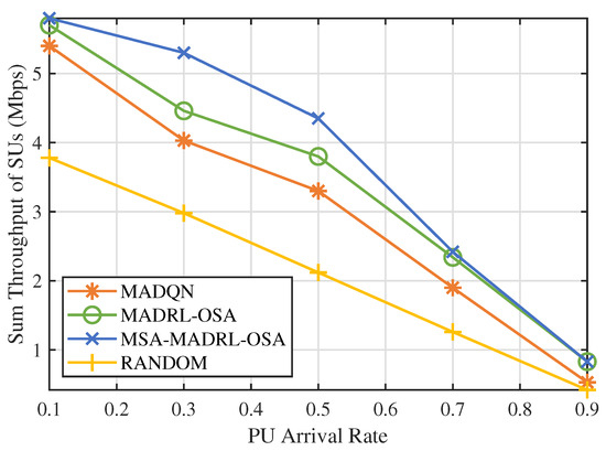 In practical environments, the activity patterns of PUs are dynamic, with their arrival rates influenced by various environmental factors. Figure 11 shows the sum throughput comparison of four methods under different PU arrival rates. The RANDOM method exhibits a linear decrease in throughput as the arrival rate increases, due to the SUs randomly selecting channels and power. MADQN, MADRL-OSA, and MSA-MADRL-OSA exhibit similar performance at low and high arrival rates. This similarity arises primarily because, at high arrival rates, PUs occupy the channels for extended periods, thereby reducing access opportunities for SUs. Conversely, at low arrival rates, SUs encounter fewer challenges in making accurate decisions, resulting in improved performance across three methods. At moderate arrival rates, the differences between the three methods become more evident. MADQN performs poorly, while MADRL-OSA and MSA-MADRL-OSA are better at adapting to changes in arrival rates. In particular, MSA-MADRL-OSA, through the multi-head attention mechanism, enhances the flexibility and accuracy of the policy, resulting in the best throughput. At arrival rates of 0.3 and 0.5, the throughput of MSA-MADRL-OSA is 18.8% and 14.5% higher than that of MADRL-OSA, respectively. This experiment validates the advantages of MSA-MADRL-OSA, which is enhanced by the multi-head attention mechanism, in complex environments.