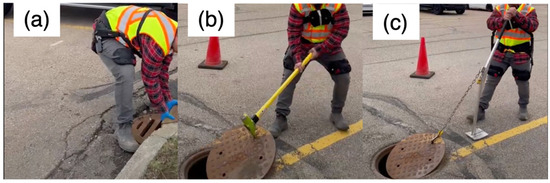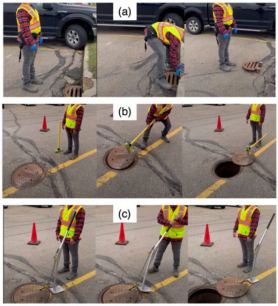 A utility worker removing an 18.1 kg (40 lbs) cover from the manhole manually, without any tools (a); the worker removing a 56.7 kg (125 lbs) cover using a Jake tool (b) and removing a 56.7 kg cover using a Lever tool (c).