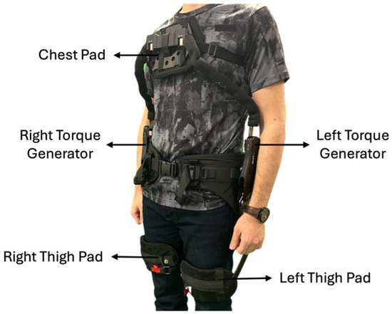 The exoskeleton used in this study was a back-support exoskeleton BackX from SuitX (Emeryville, CA, USA). The BackX has gas springs on the sides to provide trunk extension torque and has support points on the thighs and chest with a joint on the hip (Figure 2). The exoskeleton reduces gravity-induced forces and torques on the lower back by applying a supporting force to the wearer’s chest and thighs, offloading the lower back during stooping, lifting, and reaching tasks. The system activates when the user bends forward, using a passive assistive mechanism to aid movement. The exoskeleton provides bilateral support, distributing forces symmetrically across both sides of the body. This ensures balanced assistance during bending and lifting movements. The exoskeleton has two designed modes: (i) instant mode, in which the support of the exoskeleton is always activated, and (ii) standard mode, in which the exoskeleton gets activated once the user’s trunk bending angle reaches 30 degrees. The user can walk and move freely when the exoskeleton is not engaged. This exoskeleton is designed to reduce the load on the lower back musculoskeletal system while bending forward by reducing forces and torques applied to the lower back. Consequently, the activation of lower back muscles was expected to reduce with the application of the exoskeleton.