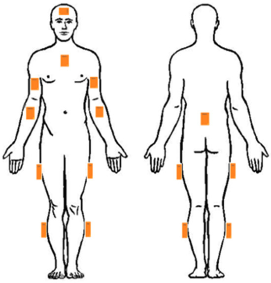IMU sensor placement on the body segment. The orange boxes represent IMUs placed on the forehead, chest (over sternum), pelvis (over sacrum), upper arms, forearms, thighs, and shanks.