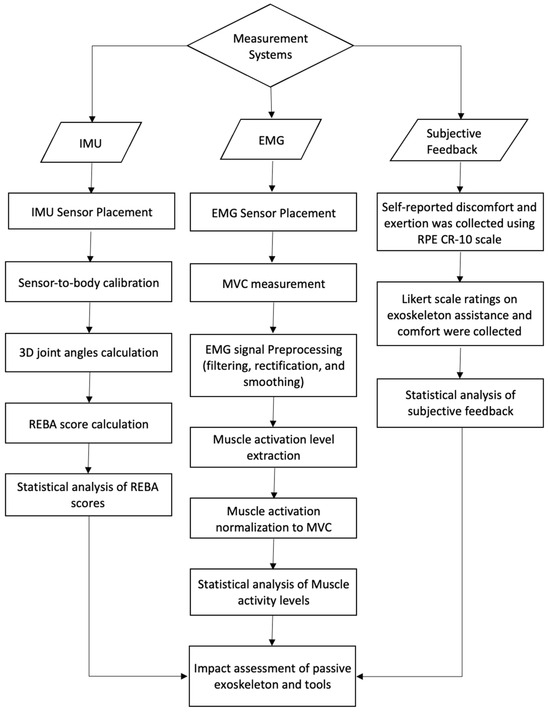 To assess the effectiveness and comfort of the exoskeleton, a rated perceived exertion (RPE CR-10) scale was employed, which allowed the participants to evaluate the level of work intensity required for each task [29]. The RPE scale was shown to participants as presented in [30], where 1 is a very light activity: hardly any exertion and 10 is a maximum effort activity: it feels almost impossible to keep going. Additionally, a questionnaire was collected at the end of the test to gather feedback from participants on using the exoskeleton and tools and their perception of the level of assistance provided in various body parts. Figure 6 shows a diagram of the measurement and data analysis steps.