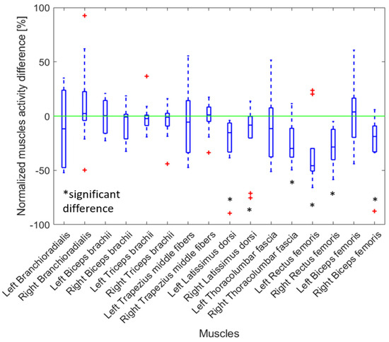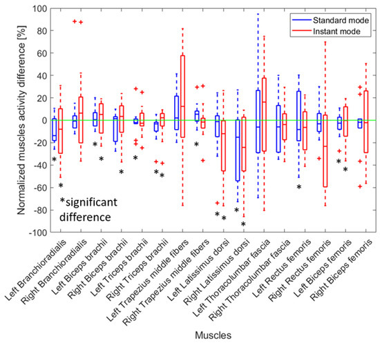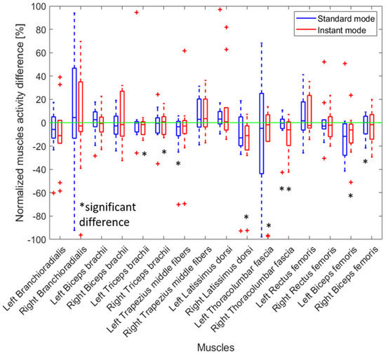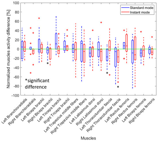 The standard mode of the back-support exoskeleton significantly increased the muscle activity of the left triceps brachii by 18.7% among participants and significantly decreased the activity of the left thoracolumbar fascia by 15.0% (Figure 8). When the exoskeleton was in instant mode, it significantly decreased the activity of the right thoracolumbar fascia by 21.5%.