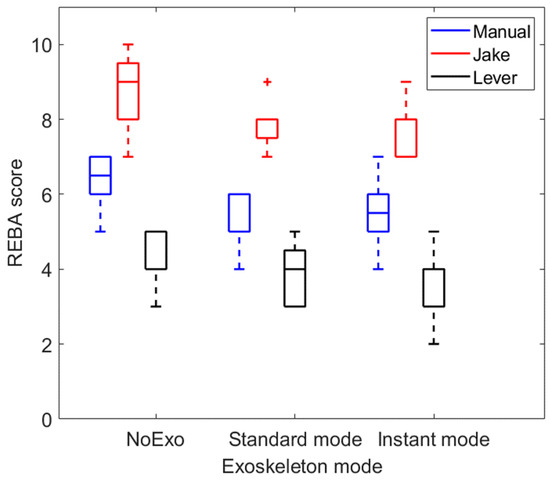 The REBA scores while removing a manhole cover using different tools and with and without an exoskeleton (in both standard and instant modes). The results for all participants are presented as boxplots. Red crosses indicate an outlier.