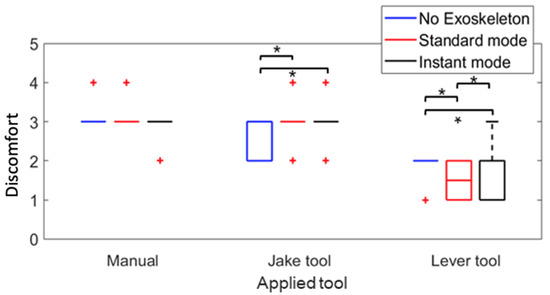 The outcomes presented in Figure 12 illustrate the participants’ self-reported feedback on the task discomfort levels using a scale of 1 to 10. The feedback was gathered both with and without the exoskeleton and for each tool (Manual, Jake, and Lever). The statistical significance of the results was evaluated using the Friedman test. The impact of wearing the exoskeleton on task discomfort depended on the tools used. When using the Lever tool, the exoskeleton significantly reduced the task discomfort compared to when an exoskeleton was not used (p < 0.05). When using the Jake tool, the exoskeleton significantly increased the task discomfort compared to when an exoskeleton was not used (p < 0.05). The use of an exoskeleton did not affect the discomfort level when the task was performed manually. The differences in reported discomfort across conditions may be due to variations in movement constraints between tools. For example, when using the Jake tool, participants performed hammering and pulling motions, which required greater trunk and hip mobility. The exoskeleton, designed to provide postural support, may have restricted these natural movements, leading to increased discomfort. In contrast, using the Lever tool involved a more upright posture with reduced forward bending, aligning more with the exoskeleton’s support mechanism. This likely contributed to the perceived reduction in discomfort in the Lever condition.