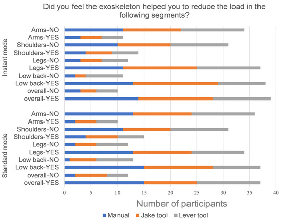 The participants were also asked about their perception of the exoskeleton assistance while using each tool during the tasks. The results were then subjected to a statistical analysis using the Friedman test, revealing that all p-values were less than 0.05. This indicates that the differences in the feedback regarding the exoskeleton’s assistance with each tool were all statistically significant. Around 80% of participants were confident that the exoskeleton could help reduce the working load on the leg and lower back, but not on the shoulder and arm (Figure 13). Also, they felt that both exoskeleton modes reduced the overall workload on the body.