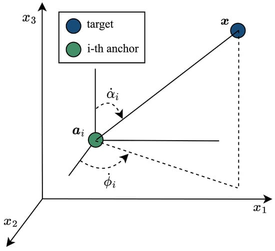 Hybrid RSS-AOA measurements have been widely used for localization. The measurement model utilizes RSS measurements to represent distance (where the RSS measurement value decreases as the distance increases), and AOA measurements to represent angle. This approach allows three-dimensional localization to be achieved with only one anchor node whose location is known, while using a single measurement model requires three or more anchor nodes. Additionally, the RSS-AOA measurement model offers high robustness against shadowing and multipath effects [], which makes it a more resilient option compared to other localization methods.