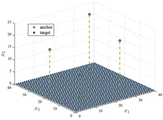 Consider a three-dimensional (3D) WSN consisting of N anchor nodes whose locations are known, denoted by , and a target node whose location is unknown, denoted by .