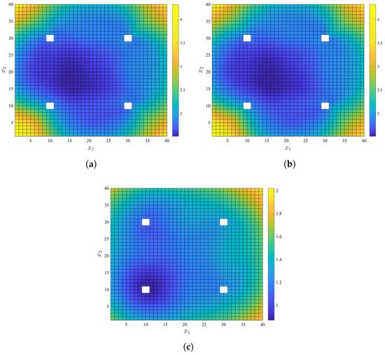 Figure 3 presents the CRLBs for only RSS, only AOA, and RSS-AOA time series models in the simple localization scenario. It is evident that the CRLB of RSS-AOA is the lowest. Moreover, at four specific target node locations, the FIM in (11) becomes a singular matrix without a matrix inverse, which explains the white spots in Figure 3a,c. It is worth noting that both CRLBs with AOA only and RSS only decrease as the target node approaches the center of the square region, while the CRLB of RSS-AOA reaches its minimum at the projection of the first anchor node in the square region. This is because RSS-AOA measurement only requires one node to achieve 3D localization and the first anchor node is highly accurate, resulting in lower CRLB for RSS-AOA when approaching the node, which means a lower theoretical minimum localization error.