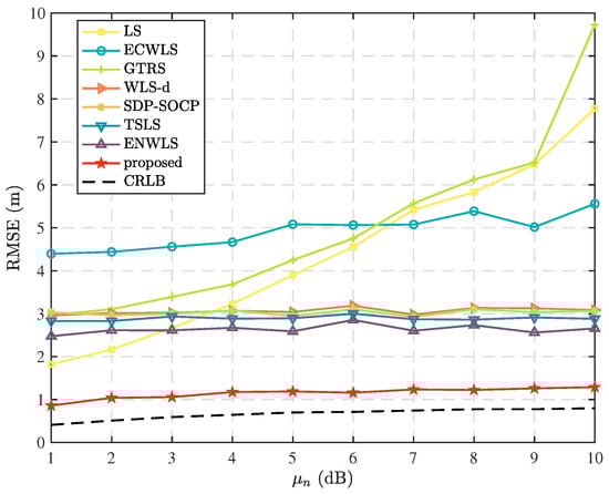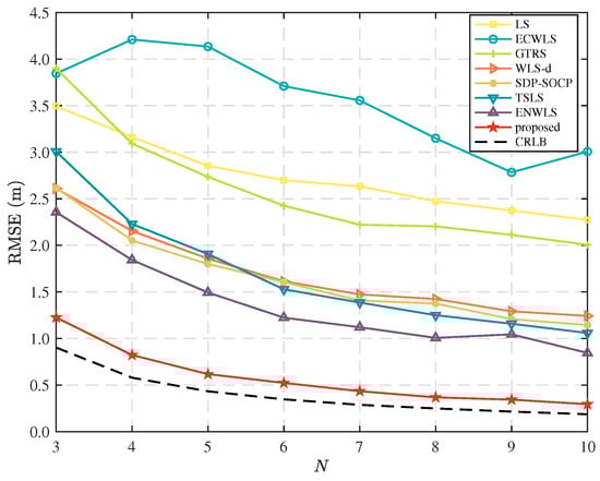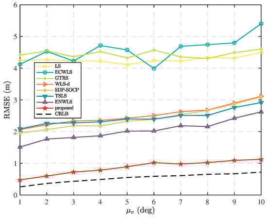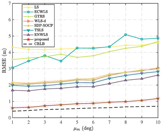 In this scenario, we examine the localization performance of different methods by varying the mean standard deviation, , of the RSS measurement errors. Figure 6 presents the comparison results when , , deg, and deg. From the figure, it can be observed that the RMSEs of the TSLS, WLS-d, and ENWLS are insensitive to changes in , while the LS exhibits a significant increase with the increase in . Different weight calculations lead to different outcomes, even though they are all WLS methods. The RMSE of the CRLB increases slightly as increases, which means that the theoretical lower bound of the localization error also increases with . This implies that the weights of RSS measurement are either too small (in TSLS, WLS-d, and ENWLS methods) or too large (in LS methods). The RMSE of the proposed method increases slightly as increases, which is consistent with the trend of the CRLB. This shows that the weights calculated by the proposed method are reasonable.