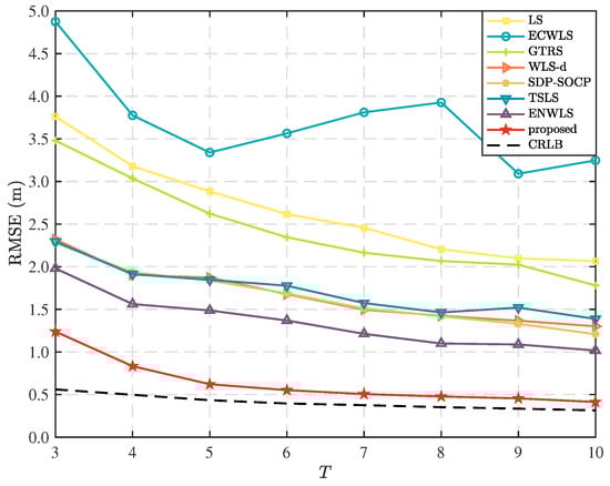 In this scenario, we keep the number of anchor nodes fixed and vary the time steps of the measurements. Specifically, we fix the number of anchor bodes to , while varying the number of time steps, T from 3 to 10, with a fixed parameters of the measurement error distributions are deg, deg, and dB. The results in Figure 8 show that the performance of the considered method improves as the time steps increase. We can see from the figure that the proposed method has low localization accuracy when and , because there are not enough data points to estimate the standard deviation of measurement errors at each anchor node. This leads to significant errors in the weight calculations and consequently, large positioning errors. However, when , the proposed method achieves high localization accuracy, with RMSE values close to the CRLB.