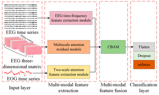 Firstly, feature extraction methods for different modal data features are designed to ensure that emotion-related information can be captured effectively and accurately. For EEG data, a multi-stream network module is used to capture the core information from different dimensions, which can comprehensively extract and analyze the multidimensional information in the signal. For EOG data, an attention-based dual-scale module is introduced to extract richer shallow features. This module combines dual-scale analysis and attention mechanisms to capture more nuanced and important emotion-related information from EOG signals. Then, in the multimodal fusion stage, we used the Convolutional Block Attention Module (CBAM) attention to fuse dual-stream EEG features and ocular features and then directly used these fused multimodal features for classification tasks.