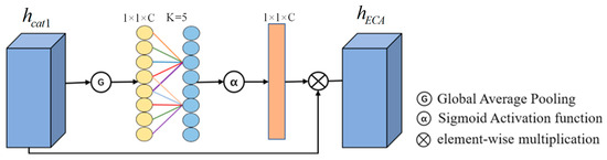 As shown in Figure 4, the ECA mechanism was used to filter the fused features, and different weights were assigned to each feature. Firstly, the global average pooling of the fused feature graph is carried out to obtain a global feature representation of . Then, based on the total number of input channels and its logarithm, the preset parameters and calculate the adaptive 1D convolution kernel size . The output of the one-dimensional convolution with a step size of 1 and kernel size is calculated by the sigmoid activation function . Finally, the weights are multiplied with the input feature graphs by the broadcast mechanism to obtain feature graphs with different weights. Finally, the output feature diagram of ECA’s attention is obtained. The detailed calculation steps are as follows: