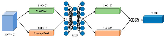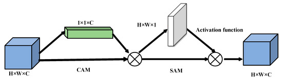 Given a feature graph , CAM generates a one-dimensional channel attention vector where each element represents the relative importance of the corresponding channel in the feature graph. At the same time, SAM also processes the input feature map to derive a three-dimensional spatial attention map , which clearly shows which areas of attention information are particularly critical at different locations in the feature map. The running process is as follows: