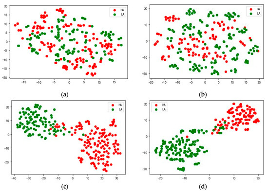 Visualization function of the MSDSANet model at different levels on the DEAP data set. (a) shows the original feature distribution of the arousal dimension of subject S23 in the DEAP data set, (b) the feature distribution of the HA and LA output by the model DSANet, (c) the feature distribution of the HA and LA output by the model MSARB, and (d) the feature distribution of the HA and LA output by the model CBAM layer.