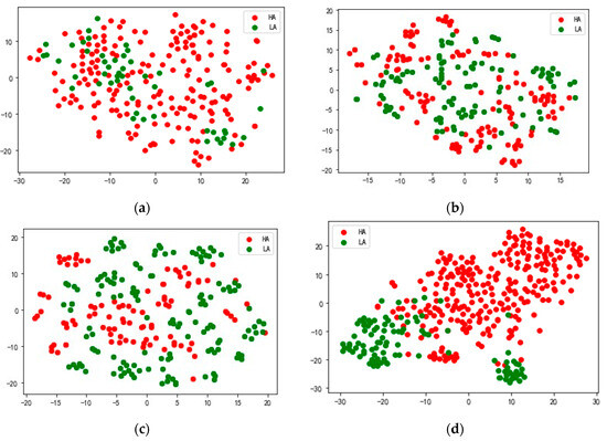 In order to better understand the feature extraction ability of the model, we use the nonlinear dimension reduction algorithm t-SNE [46] to visualize the extracted features. Taking S23 in the DEAP data set and 20 in the DREAMER data set as examples, the high-dimensional features extracted from the attention fusion layer of the test data are mapped to a two-dimensional space, and the results are shown in Figure 9. The red dots represent feature data corresponding to high arousal (HA), and the green dots represent feature data corresponding to low arousal (LA). Figure 9a shows the original feature distribution of the arousal dimension of subject S23 in the DEAP data set, Figure 9b the feature distribution of the HA and LA output by the model DSANet, Figure 9c the feature distribution of the HA and LA output by the model MSARB and Figure 9d the feature distribution of the HA and LA output by the model CBAM layer.