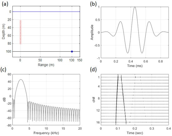(Color online) (a) simulation geometry of array and source, (b) Gaussian pulse signal in the time domain, (c) spectrum of the source signal, (d) received signal in the environment shown in Figure 1a.