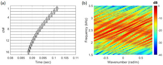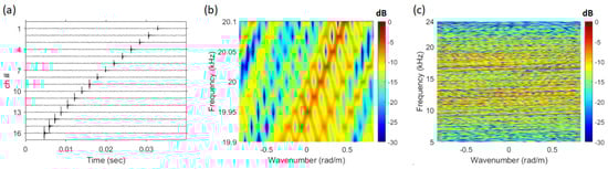 The signal used for analysis was processed using only the direct wave, as shown in Figure 2a (0.08 s–0.11 s). # indicates the number of the array. The frequency–wavenumber spectrum of the signal received as a direct wave is shown in Figure 2b. Due to the short propagation range, the received signal exhibited the characteristics of a curved wavefront. As a result, in the frequency–wavenumber spectrum, the striations were visualized not as a single slope but as overlapping slopes with similar inclinations.