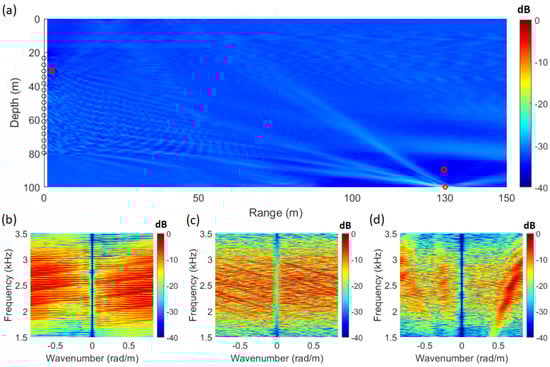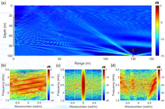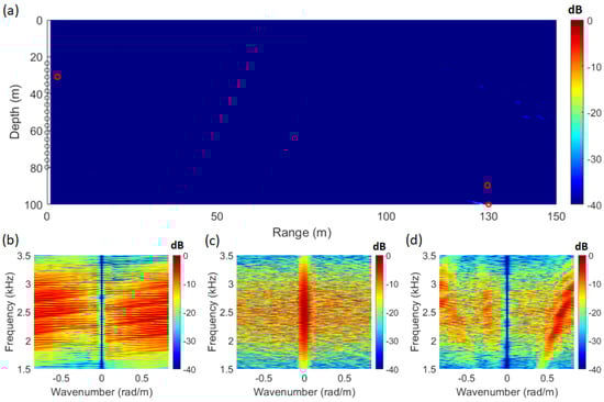 By applying Equation (1) using the signal from Figure 2a and the replica computed through the acoustic propagation model, the SFK spectra corresponding to each location are obtained, as shown in Figure 3b–d. At the source location (distance: 130 m; depth: 100 m), the striations become vertically aligned, as illustrated in Figure 3c. Utilizing this characteristic, Figure 3a was visualized by integrating the energy at wavenumber zero across the frequency range. The ambiguity surface in Figure 3a is defined by Equation (9), with the integration range set to the frequency band of the source signal, from 1.5 kHz to 3.5 kHz.