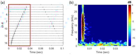 A sample of 100 ms data (47.135 s 47.235 s) was used for the analysis (JD146 16:51). Figure 7a shows the received shrimp sound data at each channel, and if the spectrograms were made using the signal (only direct path, red box in Figure 7a.) received by the receiver of channel 16 close to the sea floor, they are shown in Figure 7b. # indicates the number of the array. The frequency band of the shrimp sound is 5–24 kHz, as can be seen in Figure 7b, and direct paths and surface paths exist in 100 ms data. The design frequency of the array, 200 Hz (sensor spacing was 3.75 m), is sufficiently sparse when compared to the frequency band of shrimp sounds.