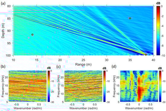 Due to the short pulse length of 20 ms in the analyzed signal, it was challenging to satisfy the rank condition of the CSDM. Therefore, the diagonal loading technique was applied, with 10% of the signal power used. Compared to the results in Figure 3a, the results in Figure 4a showed a difference of approximately 25 dB in dynamic range. Since the environment is noise-free, a more detailed analysis will be conducted using additional data. Figure 4b represents the MV+SFK spectrum at a distance of 1 m and a depth of 30 m, Figure 4c corresponds to a distance of 130 m and a depth of 100 m, and Figure 4d represents a distance of 130 m and a depth of 90 m. A key characteristic of the MV+SFK spectrum is that the Bartlett SFK spectrum results are altered at wavenumber zero. This occurs because, at nonzero wavenumbers, the interaction between and the spatial Fourier transform term prevents from functioning properly. However, the proposed method in this study only utilizes the energy at wavenumber zero, meaning that the improper operation of at nonzero wavenumbers in the MV+SFK spectrum is not an issue. Therefore, to apply an adaptive processor to this method, the adaptive weight vector should be computed and substituted into the beam-steering process.