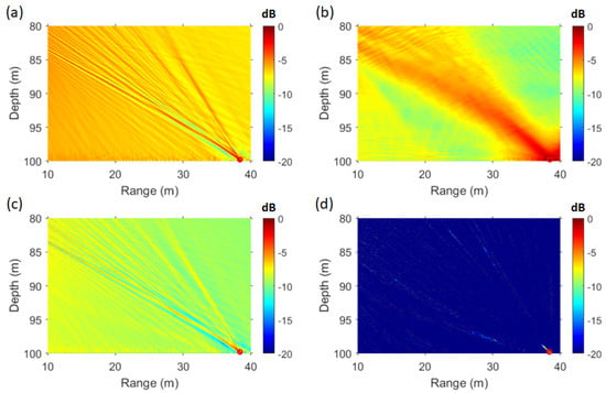 In Figure 9a, the maximum point of the ambiguity surface is located at a distance of 38.39 m and a depth of 99.8 m. The SFK spectrum at this point is shown in Figure 9d. As observed in Figure 9d, at the estimated source location, the striations become vertically aligned at wavenumber zero. In contrast, Figure 9b,c show that the striations change direction at different slopes. Figure 9b represents the SFK spectrum at a distance of 14 m and a depth of 92 m, while Figure 9c corresponds to a distance of 35 m and a depth of 85 m. These figures illustrate the SFK spectra at locations other than the source location, as the transfer function at these points does not correspond to that of the source. The distance and depth intervals in Figure 9a are set to 0.01 m, considering that snapping shrimp, which inhabit the coastal waters of South Korea, are known to have a body length of approximately 2–4 cm [35]. Applying CMFP, AMFP, and FDMFP techniques to the same dataset revealed that only FDMFP and the SFK method successfully estimated the shrimp’s location [7]. Although the target location was successfully estimated, the sidelobe level difference was approximately 6 dB, with the PSR values of 9.68 dB for the SFK method and 6.65 dB for the FDMFP method. Given that this localization method operates effectively even in sparse environments, an additional adaptive technique was applied to further enhance localization performance. The localization results of FDMFP were compared with those of MV+SFK and WNC+SFK, as shown in Figure 10.