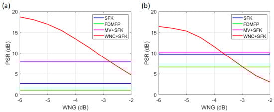 Figure 5c shows that, unlike Figure 4c, the striation pattern is more similar to that of the Bartlett SFK spectrum. Additionally, the sidelobes in the ambiguity surface are significantly reduced. To quantify this improvement, performance was evaluated and compared using the PSR metric in Equation (8). The WNC method enhances processing stability by adjusting the magnitude of the weight vector through appropriate gain control between MV and Bartlett. Generally, the boundary range is known to be between −6 dB and −2 dB [31]. To analyze whether the PSR of WNC is appropriately adjusted between MV and Bartlett, the WNG was varied from −6 dB to −2 dB in 0.5 dB increments.