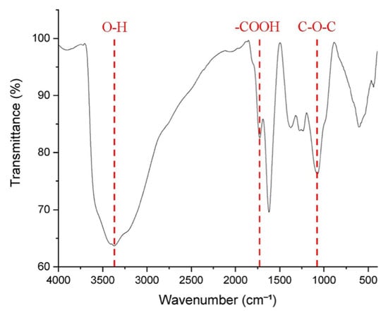 The characteristics of GO significantly influence the quality of GO-PVA composites. To confirm the successful preparation of GO, Fourier Transform Infrared Spectroscopy (FTIR) was performed using a JASCO FT/IR-4200 (Tokyo, Japan) within the wavenumber range of 400 cm−1 to 4000 cm−1, which is typical for organic molecules. The objective was to detect the characteristic functional groups commonly associated with GO. As shown in Figure 2, the FTIR spectrum exhibited a hydroxyl absorption band in the region of 3250–3500 cm−1. Since hydroxyl groups readily form hydrogen bonds with water molecules, their quantity directly influences the hydrophilicity of GO. The results revealed a noticeable intensity in the hydroxyl absorption band, indicating that the GO produced in this experiment exhibited sufficient hydrophilicity. This property facilitated its dispersion in deionized water, thereby improving the uniformity of the subsequently prepared GO aqueous solution.