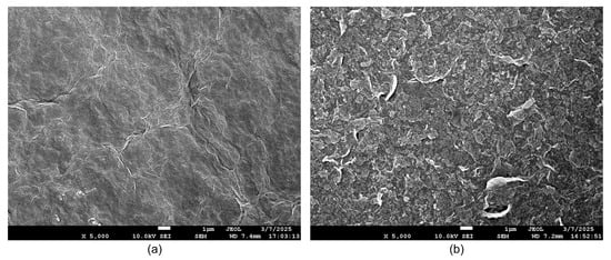 Additionally, absorption bands corresponding to carboxyl and carbonyl groups were observed around 1720 cm−1, while an epoxy group absorption band was detected at approximately 1080 cm−1. These findings align with those of Kanta et al. [], confirming the successful oxidation of graphite via the Hummer’s method. Following the preparation of the GO aqueous solution, the oxygen-containing functional groups interacted with the hydroxyl groups of PVA through hydrogen bonding, leading to the formation of a GO-PVA composite film.