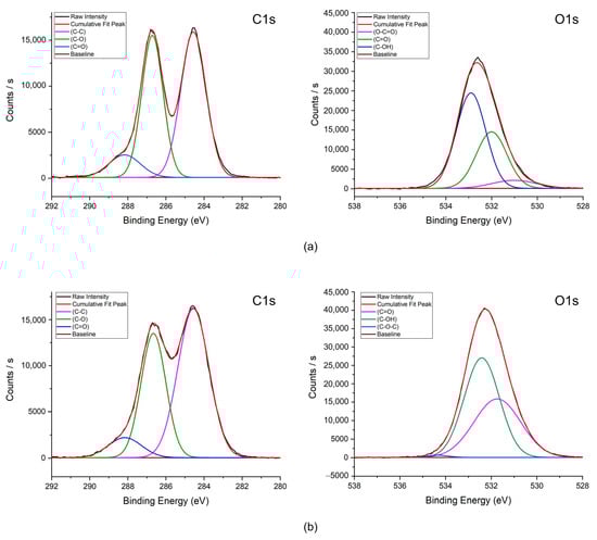 In addition, Figure 4 shows the XPS spectra of GO and GO-PVA. From the C1s spectrum of GO, the peaks at 284.56, 286.71, and 288.17 eV correspond to C–C (34.40 at.%), C–O (28.28 at.%), and C=O (6.65 at.%), respectively, which represent the primary components of GO. Since PVA mainly contains C–OH groups, the C1s spectrum of GO-PVA shows that the C–O peak (286.66 eV, 23.97 at.%) is influenced by the hydroxyl (-OH) groups of PVA molecules, while the at.% of C=O (288.16 eV, 5.16 at.%) is reduced due to hydrogen bonding interactions between GO and PVA, which partially suppress the formation of C=O bonds.